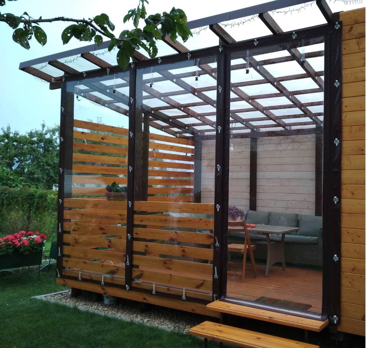 При остеклении беседок и веранд все чаще отдают предпочтение мягким окнам. Они гораздо дешевле пластиковых окон ПВХ, и их можно легко устанавливать и убирать самостоятельно. Мягкие окна позволят наслаждаться природой в любую погоду. Они обладают высокой эластичностью и прочностью на разрыв.